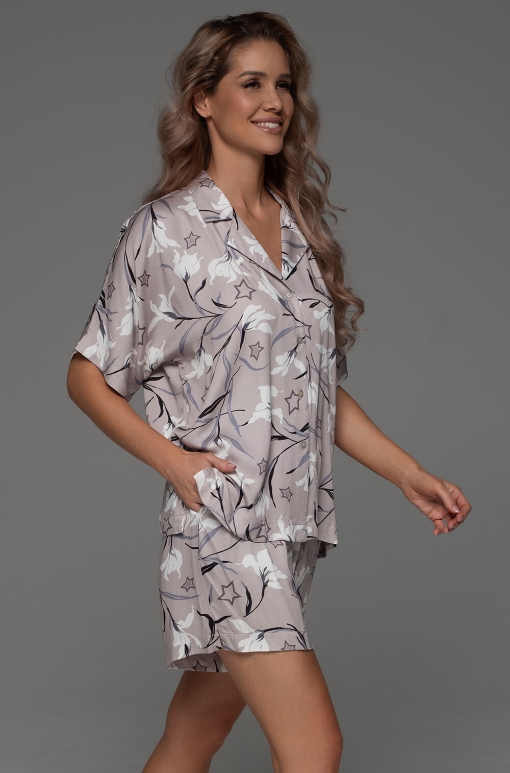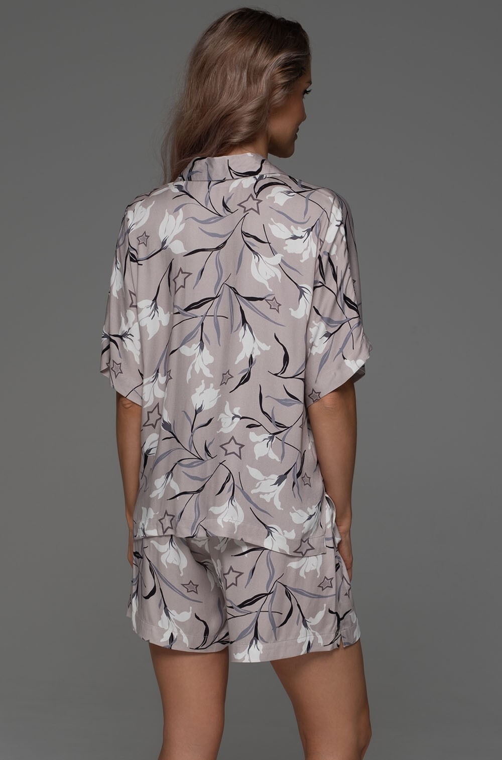 Комплект Mia-Amore состоит из рубашки с застежкой на пуговицы свободного силуэт, со спущенными плечами и шорт свободного силуэта на резинке. Комплект выполнен из смесового вискозного полотна. В шортах есть кармашки и разрезы.