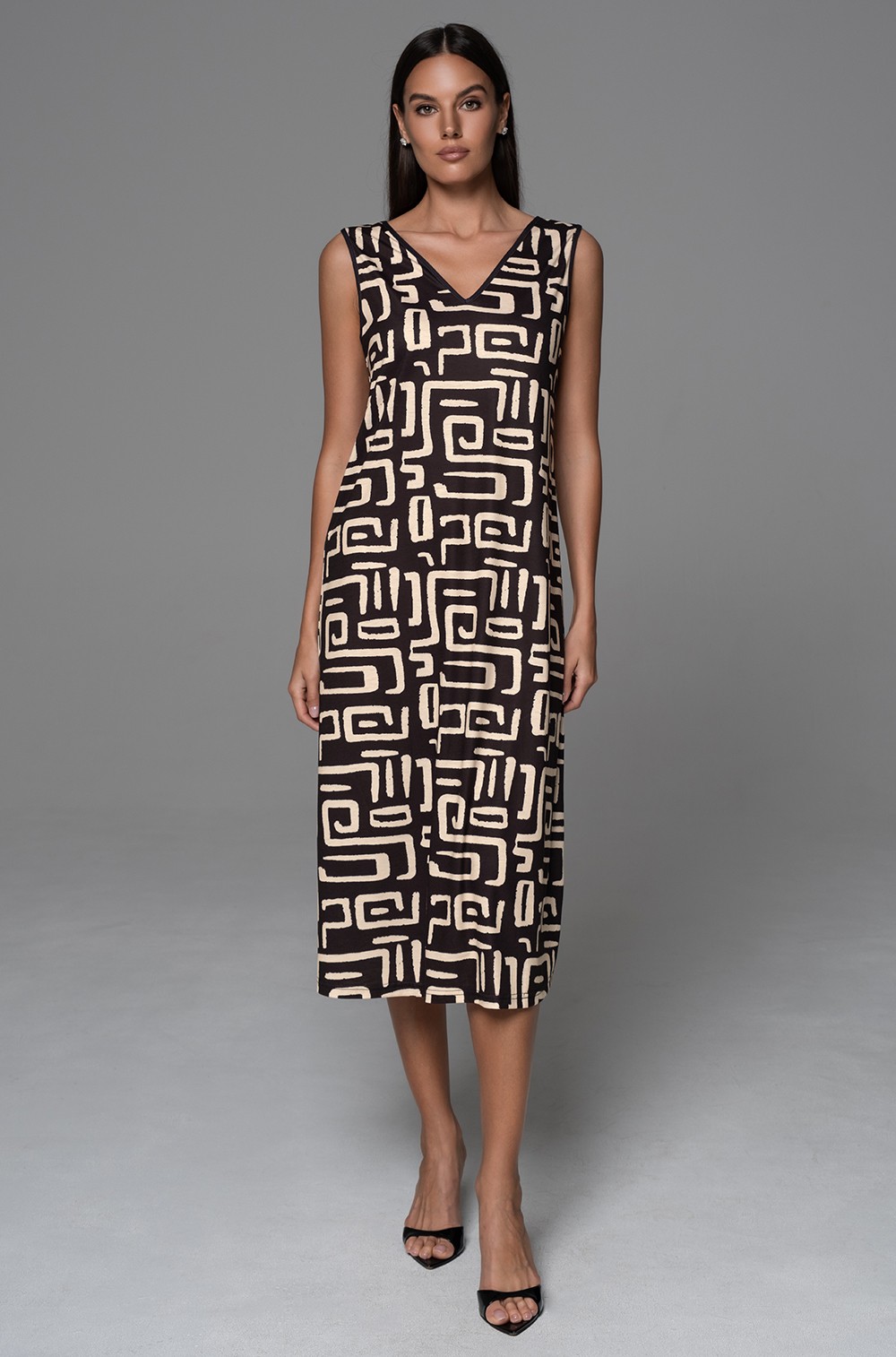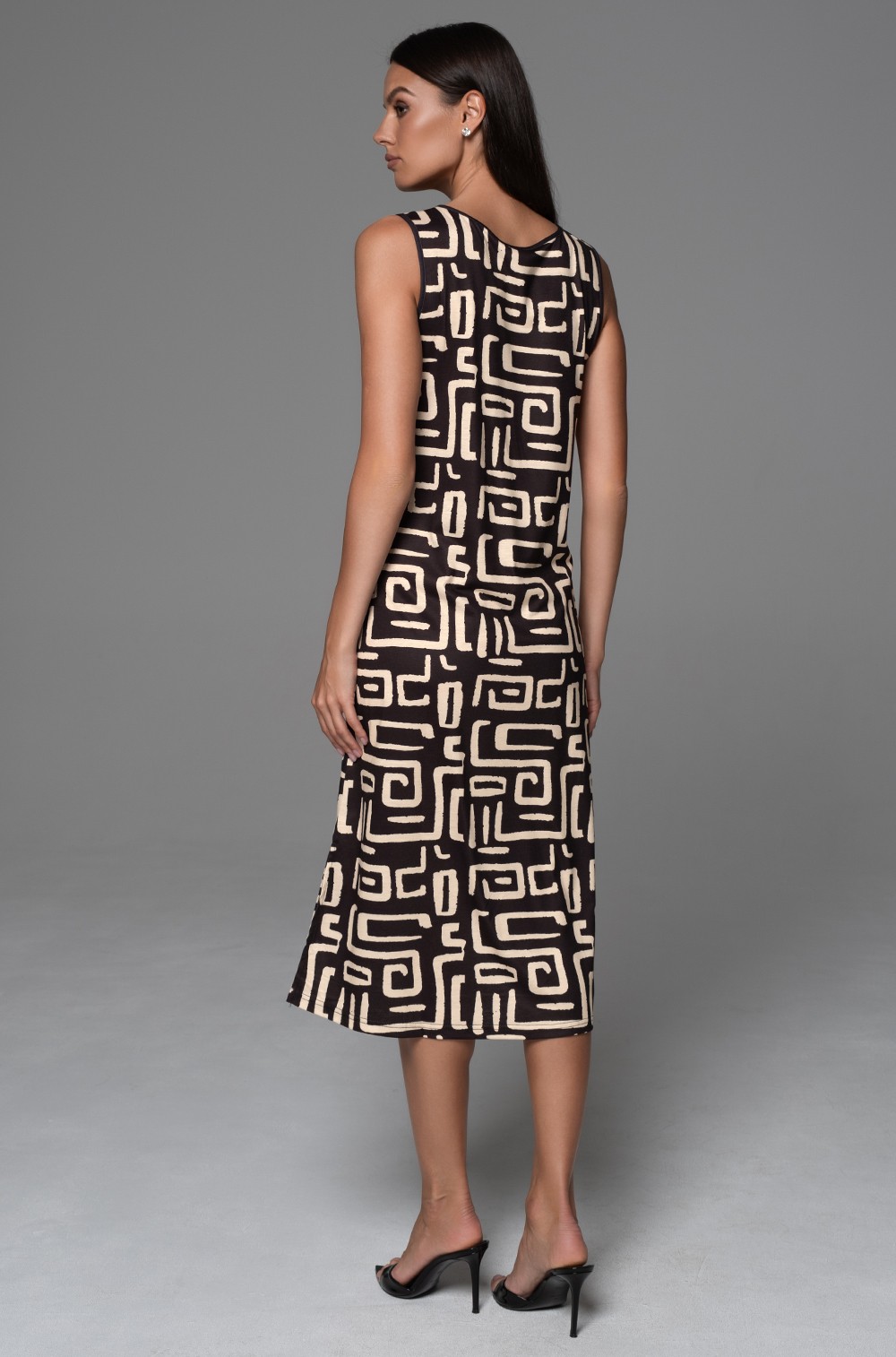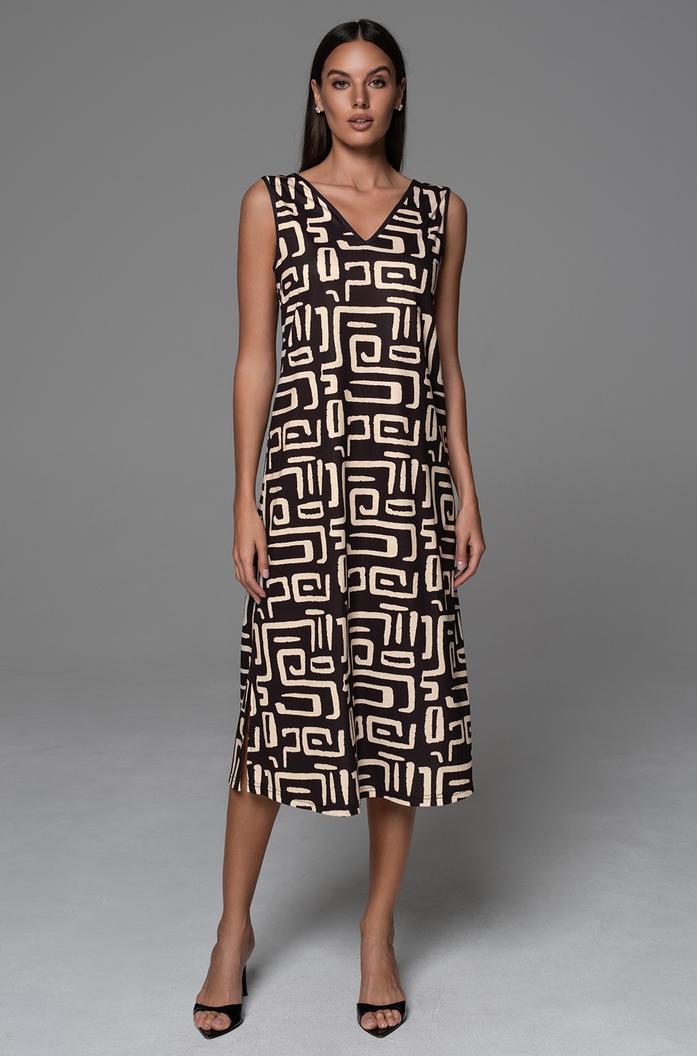 Длинная сорочка Mia-Amore на широких бретелях без подреза под грудью, полуприлегающего силуэта, выполнена из принтованного трикотажного полотна. По бокам обработаны разрезы для свободы движения.