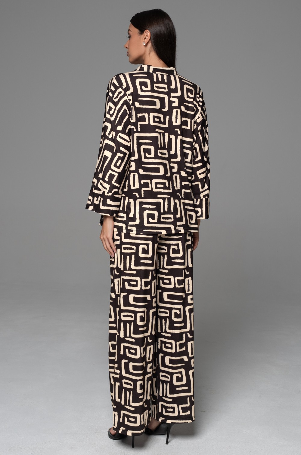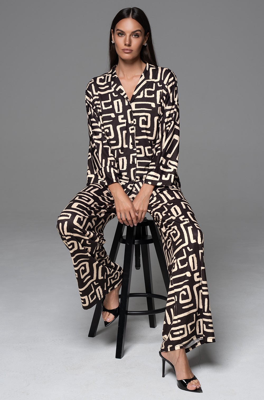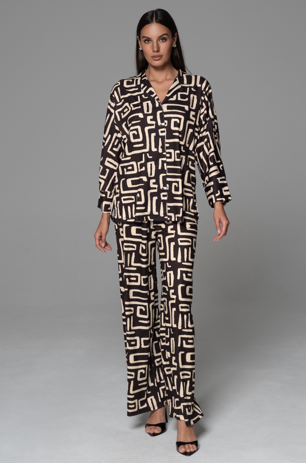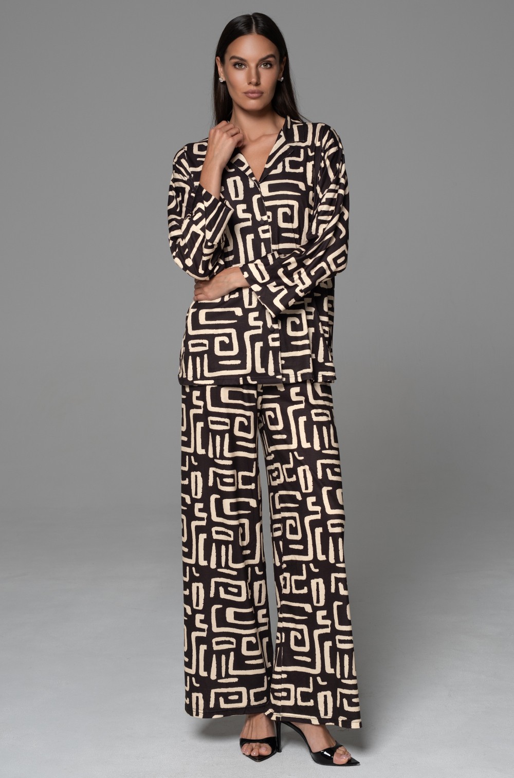 Комплект Mia-Amore состоит из жакета с длинным рукавом и широких брюк. Изделия комплекта выполнены из принтованного трикотажного полотна.