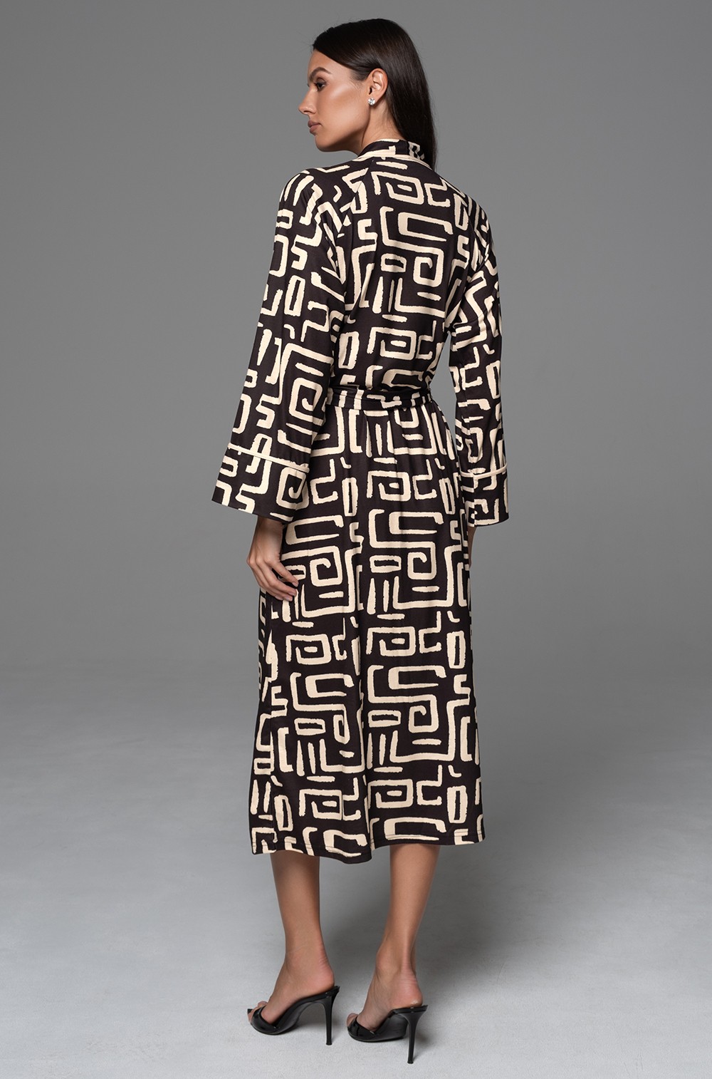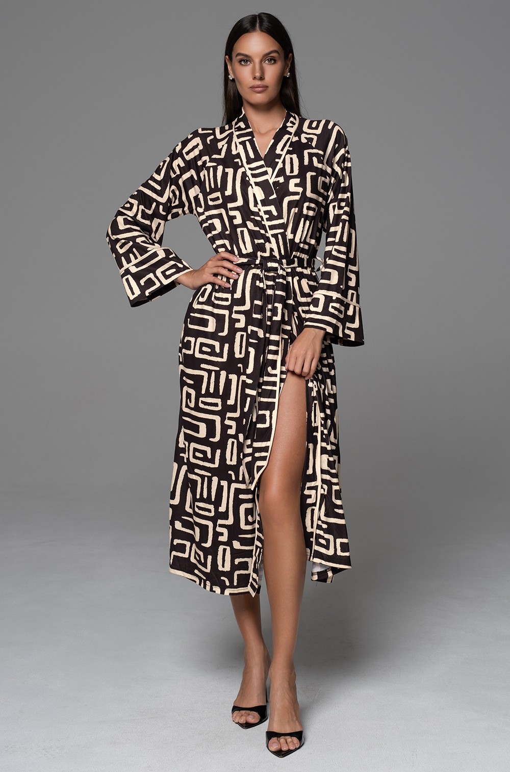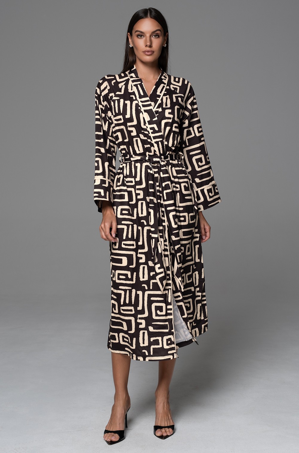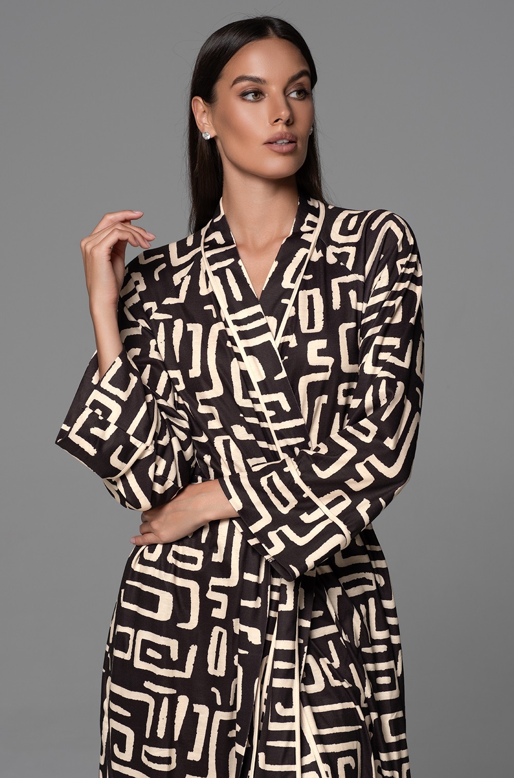 Длинный классический запашной халат Mia-Amore с длинным рукавом. Халат выполнен из принтованного трикотажного полотна. В боковых швах расположены карманы.