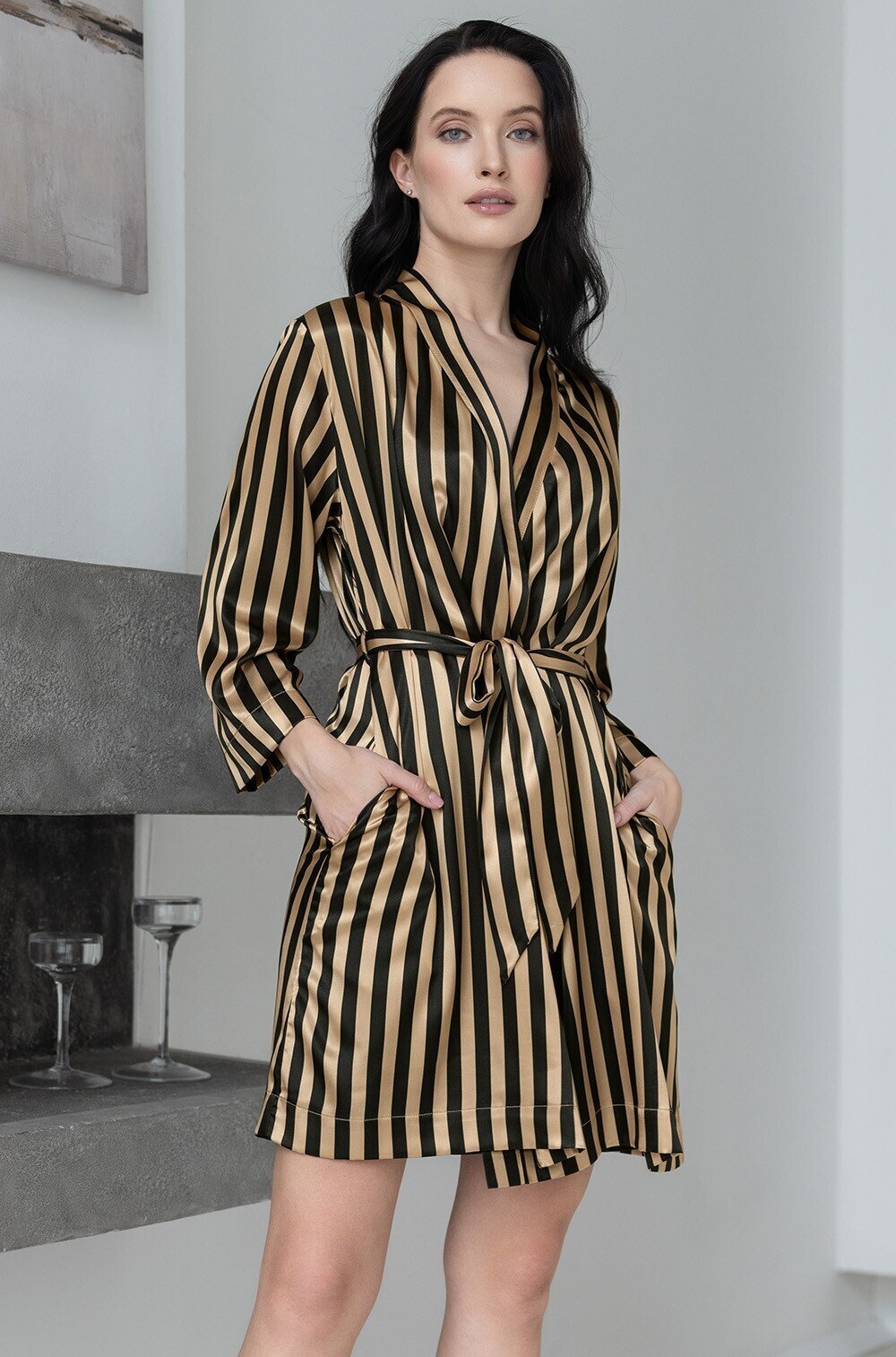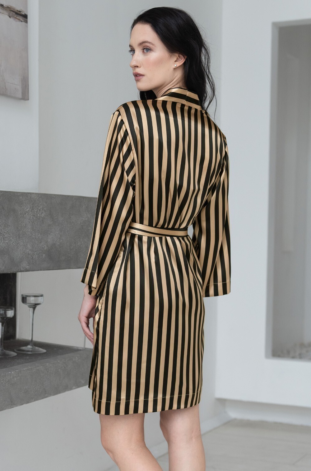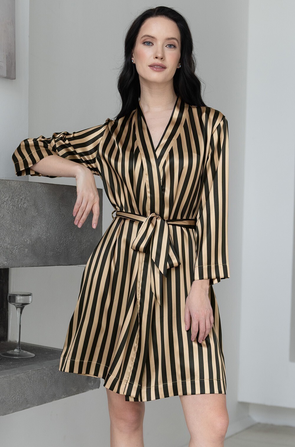 Роскошный халат с атласным блеском и эффектным вертикальным принтом придаст твоему образу нотки шика и уверенности — даже дома.