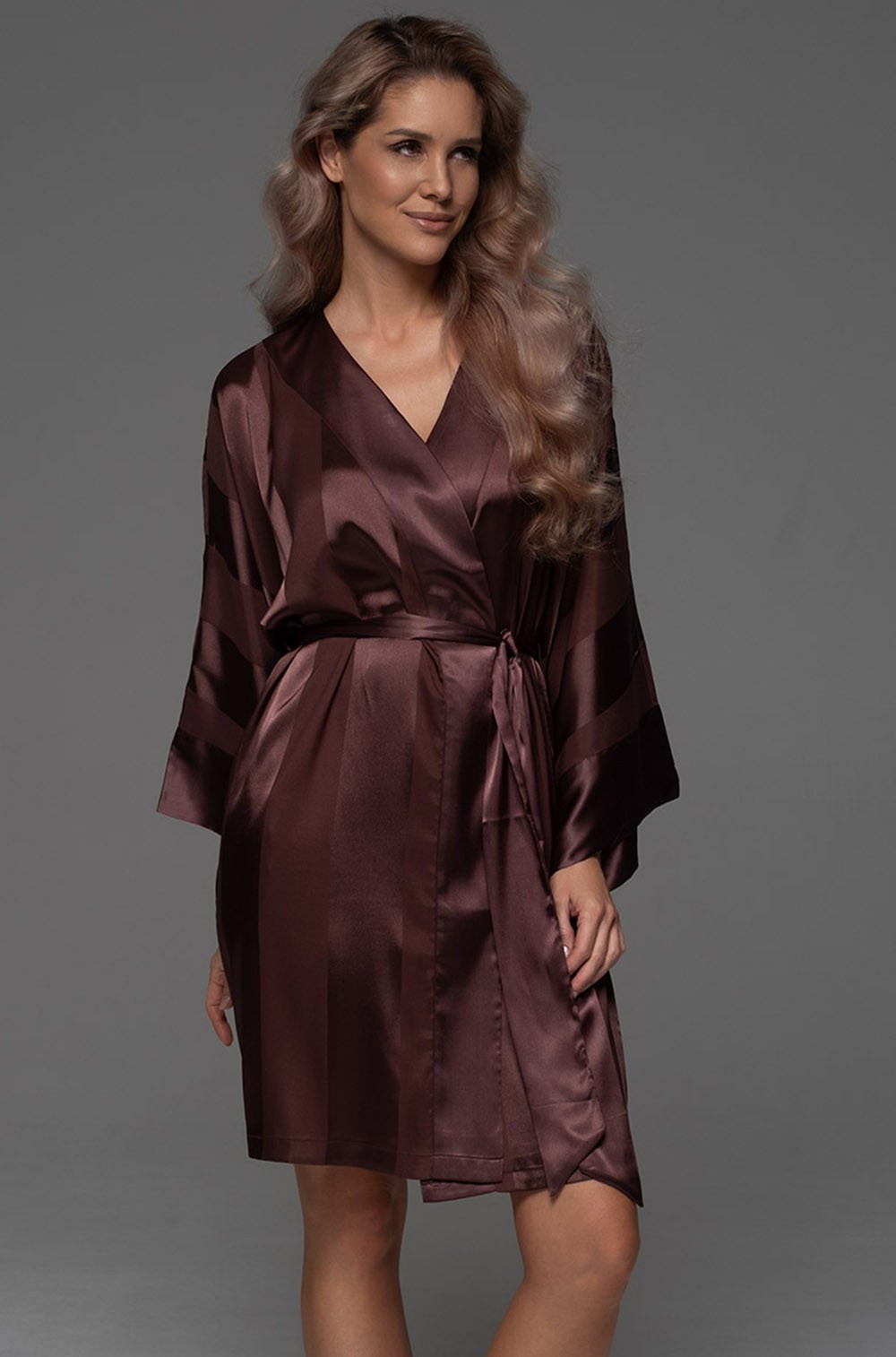 Почувствуй себя королевой даже в домашней обстановке с запашным халатом Mia-Amore. Модель выполнена из благородного искусственного шелка с жаккардовыми полосами, которые создают выразительный визуальный эффект за счёт чередования горизонтального и вертикального направления.