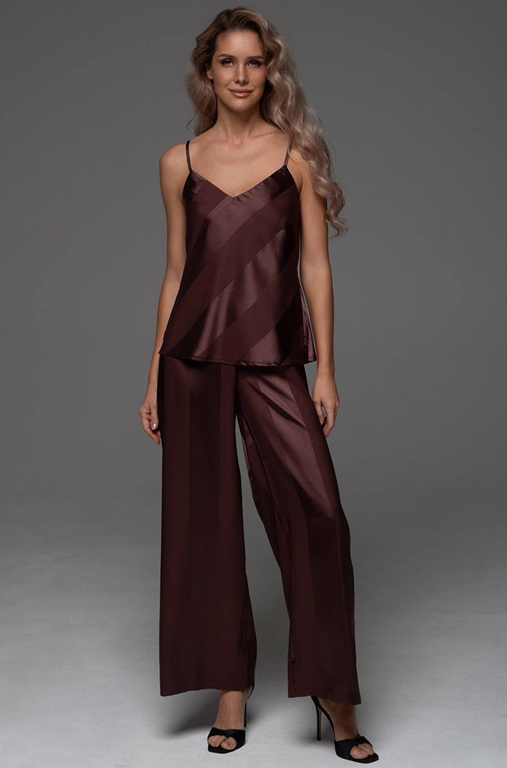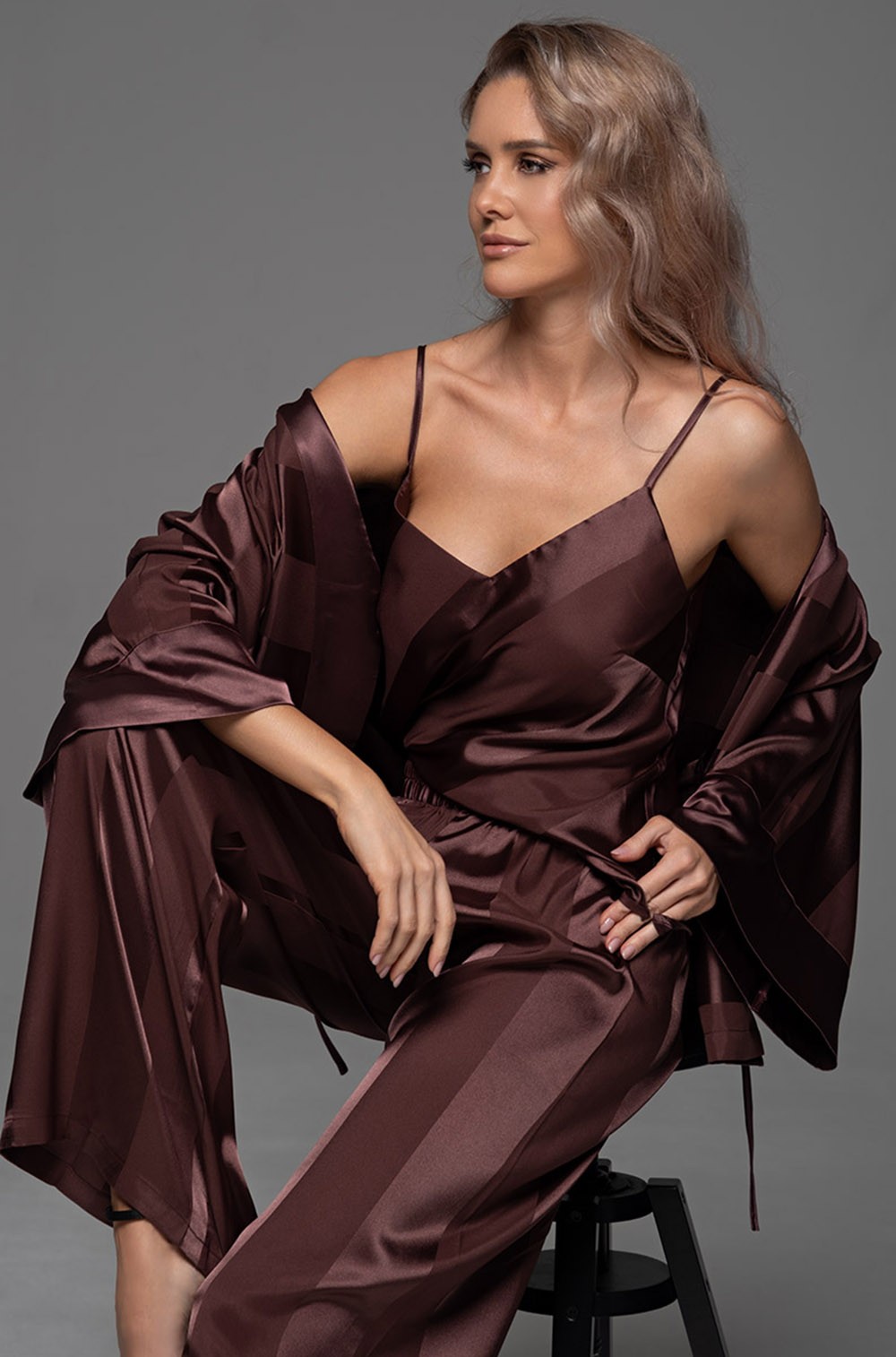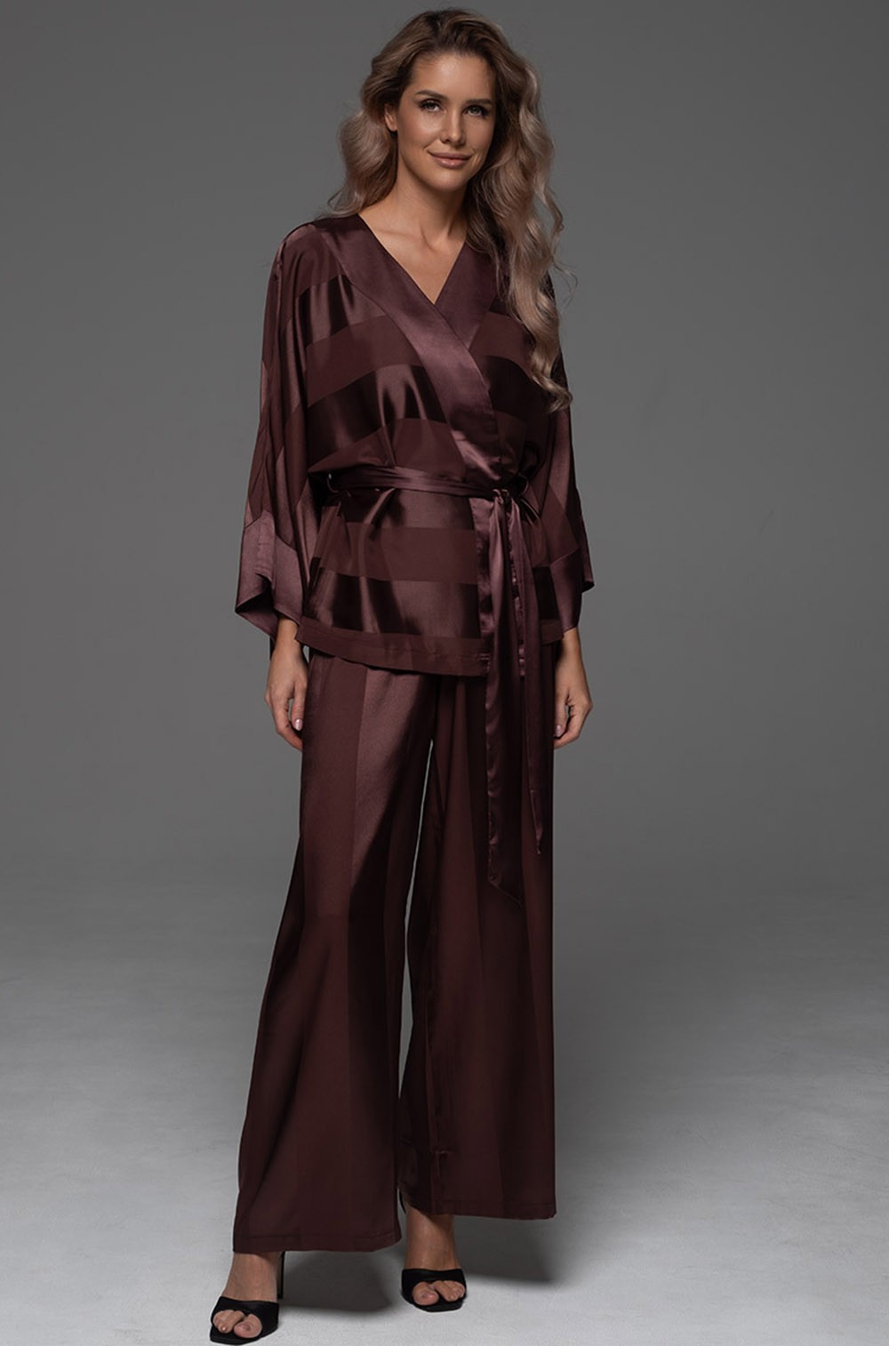Все элементы выполнены из однотонного искусственного шелка на жаккардовой основе. Игра фактур достигается за счёт чередования горизонтальных и вертикальных полос, что добавляет образу глубины и изысканности. Свободный крой и мягкое прилегание дарят абсолютный комфорт, а пояс позволяет акцентировать линию талии.
