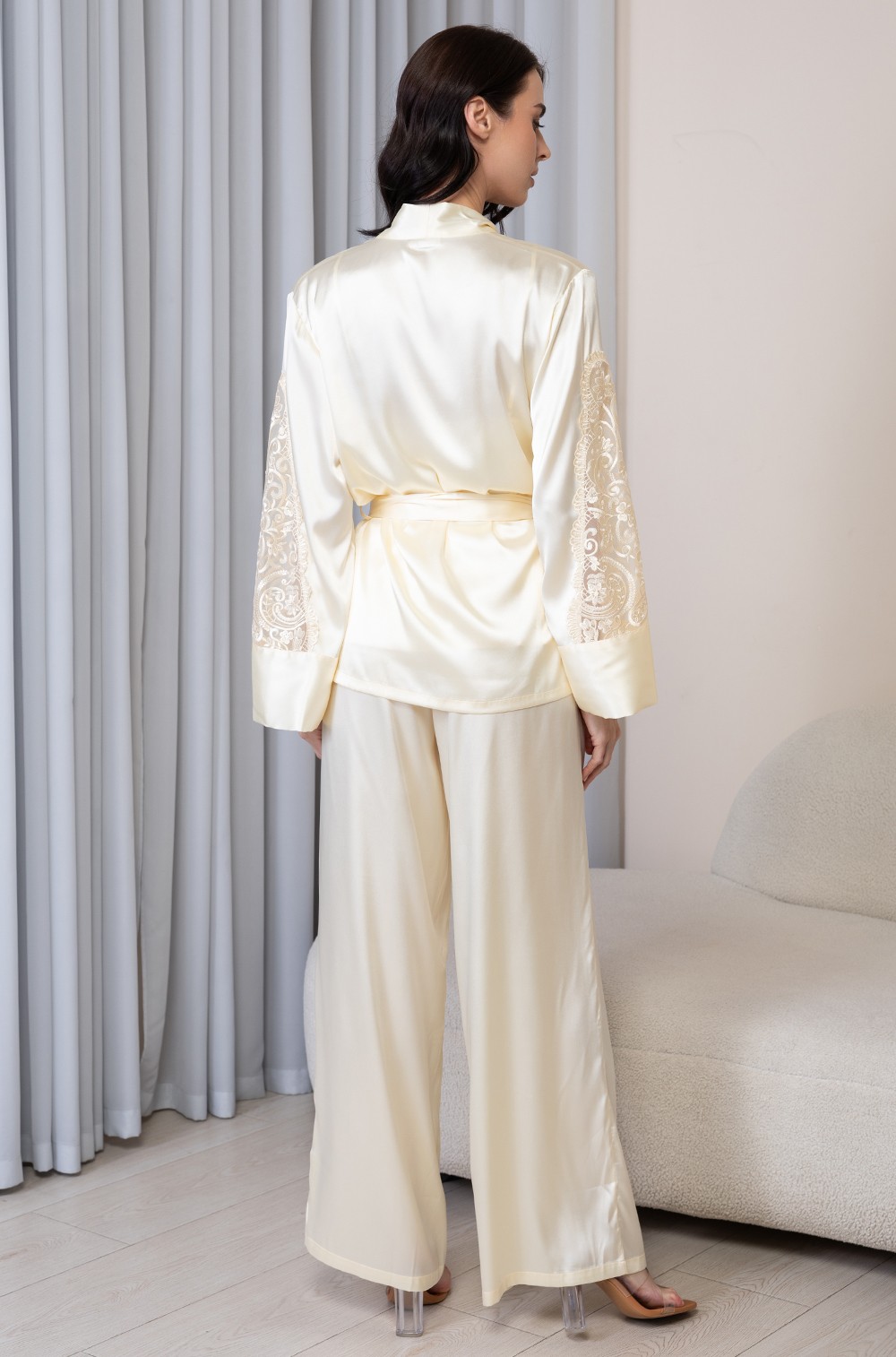 Комплект-тройка Mia-Amore состоит из топа, брюк-палаццо и запашного жакета, выполнен из однотонного смесового шёлка. Спереди вырез топа декорирован узким кружевом и бантиком с подвеской. На рукавах жакета вставки из кружевных элементов. Модель комплектуется широким поясом.