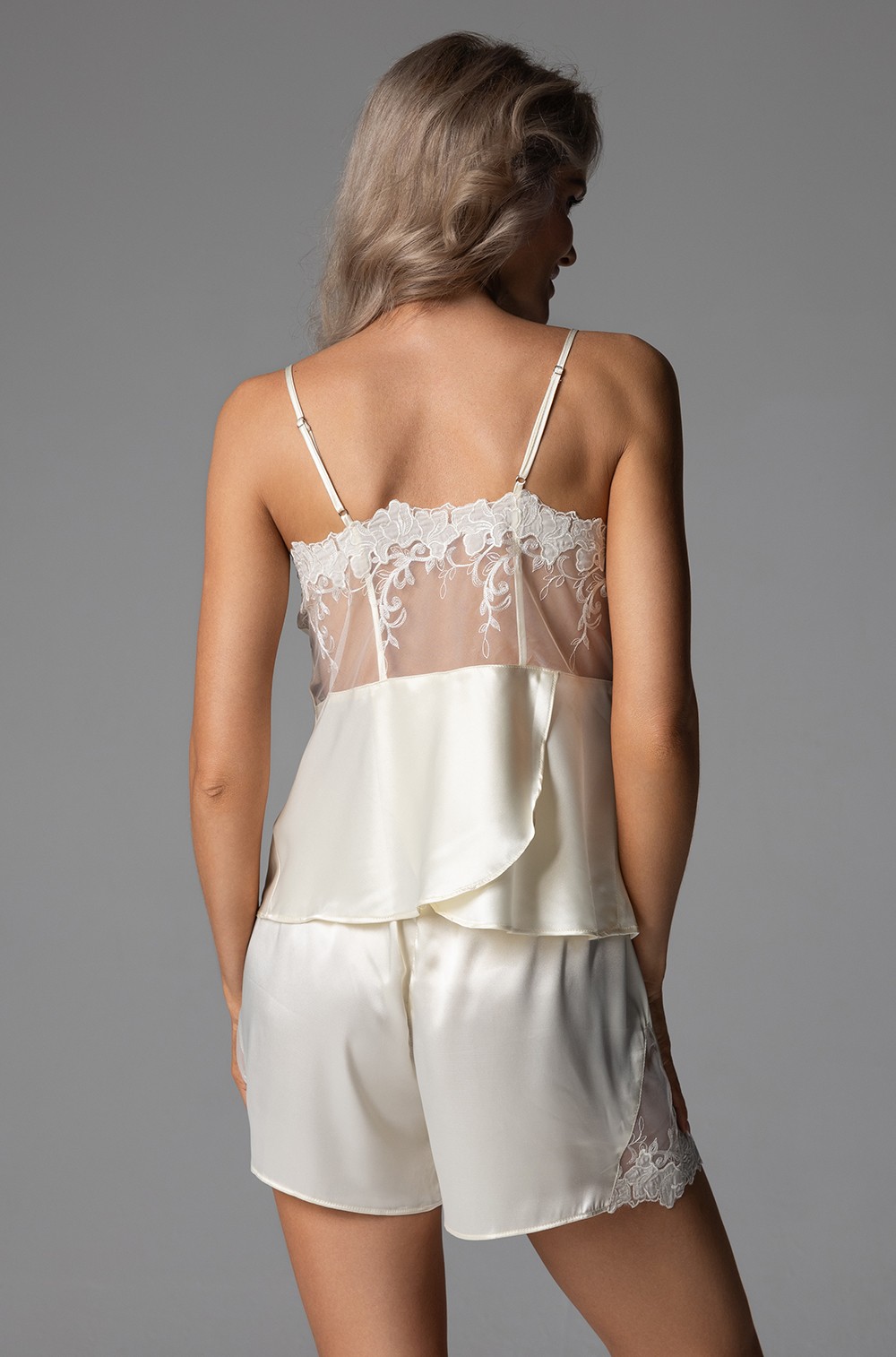Комплект Mia-Amore состоит из топа и шорт, выполнен из однотонного смесового шёлка. Вырез спинки топа и шорты по низу украшены вставками из вышивного кружева. Спинка топа выполнена в виде декоративного наложения двух деталей.