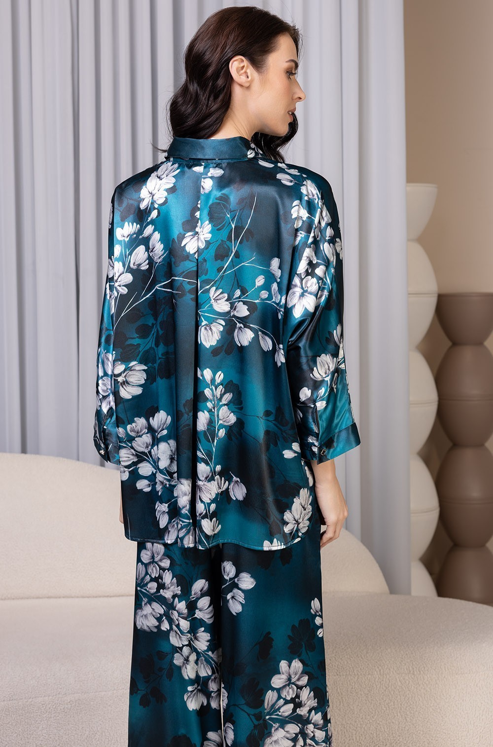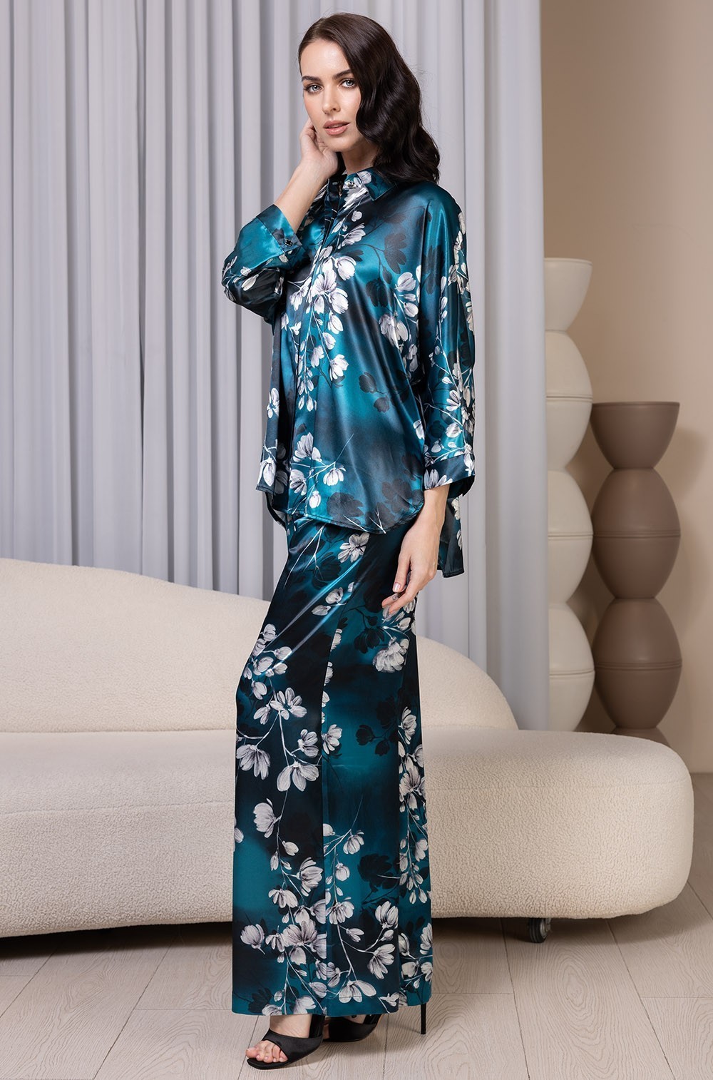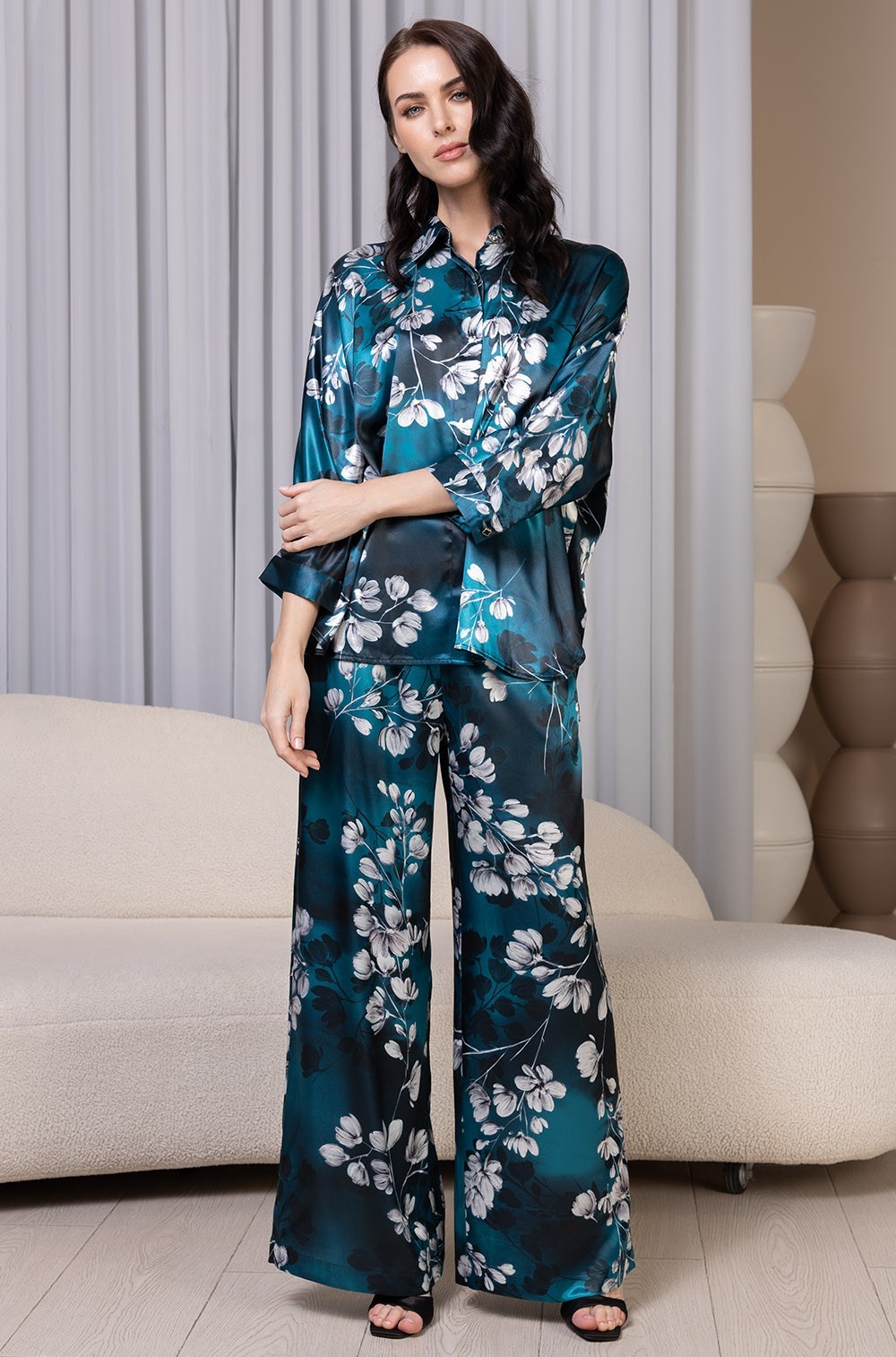 Комплект Mia-Amore состоит из рубашки и брюк, выполнен из смесового шёлка с цветочным фантазийным принтом. Рубашка свободного силуэта с застёжкой на пуговицы по центру, с рукавами длиной 7/8 с манжетами по низу. Брюки свободного силуэта с эластичным поясом и карманы в боковых швах.