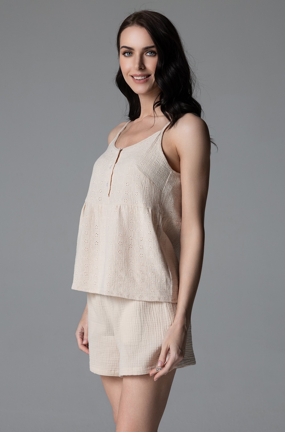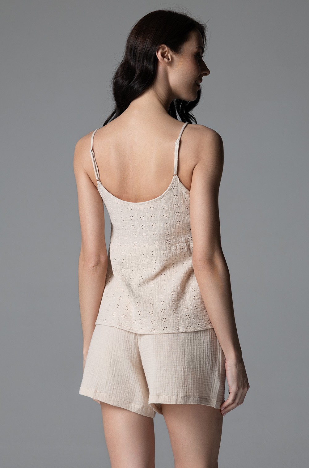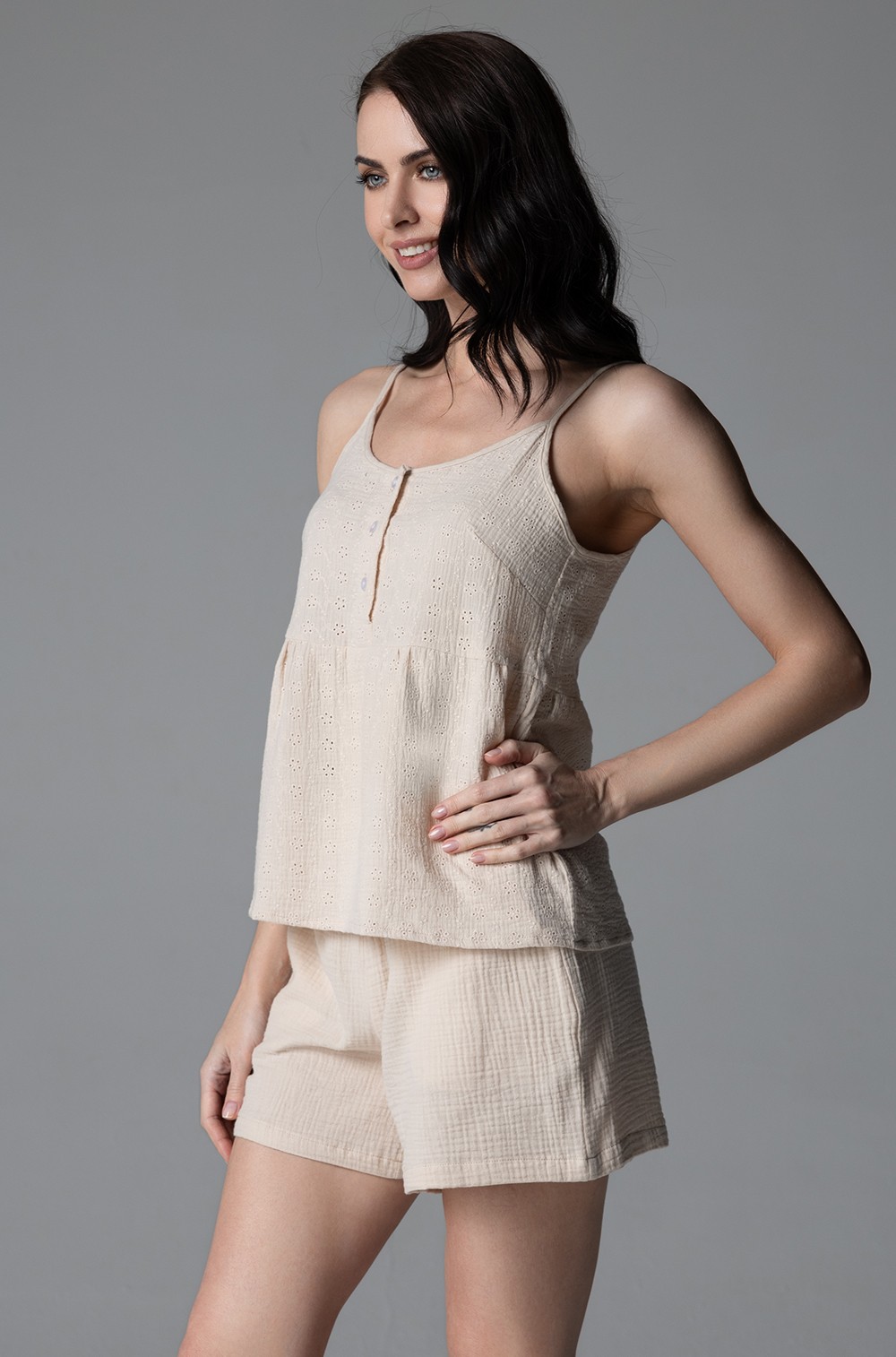 Комплект Mia-Amore состоит из топа на тонких бретелях и шорт. Комплект выполнен из однотонного хлопкового муслина с вышивкой. По центру топа расположена планка с пуговицами. По бокам шорт расположены карманы.