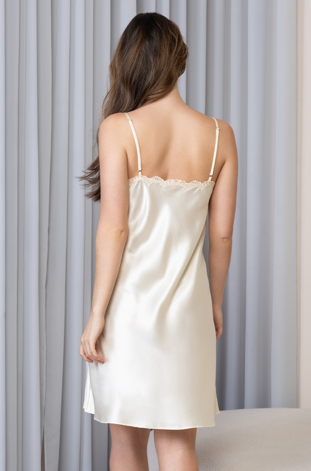 Короткая сорочка Mia-Amore без подреза на тонких регулируемых бретелях выполнена из однотонного смесового шёлка. Сбоку сорочку украшают вставки из элементов вышивного кружева. Верх лифа декорирован узким вышивным кружевом. По центру спереди расположен декоративный бантик с подвеской.