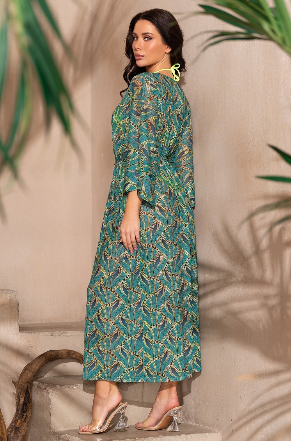 Длинный пляжный халат Mia-Amore с широкими длинными рукавами. Изделие выполнено из принтованной эластичной сетки. Ширина по линии талии регулируется за счет кулисы.